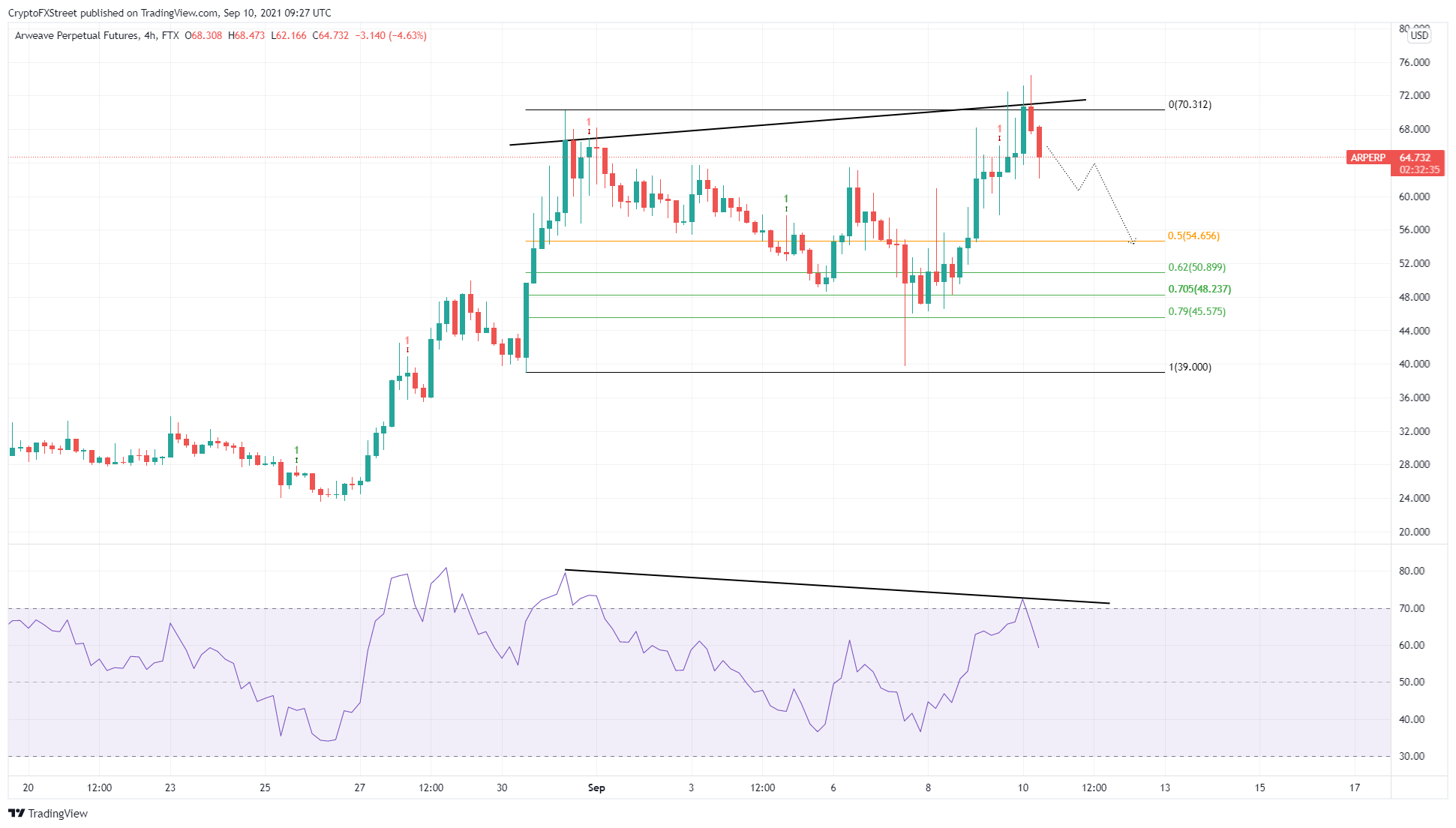 This time, Arweave price rose 87% and set up a new all-time high at $74.49, but failed to sustain this uptrend and is currently showing signs of entering a downward trend.