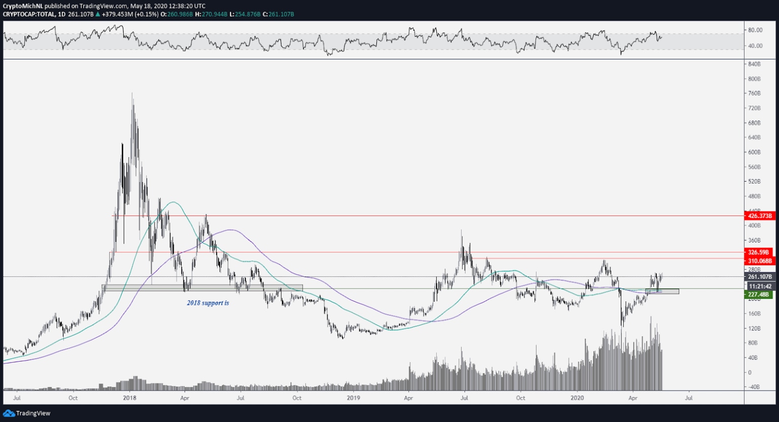 First of all, the total market capitalization is finally flipping the 2018 level for support again. That support level can be classified as the support on Bitcoin at $6,000. The price of BTC saw many bounces at that level in 2018 before the big crash occurred.