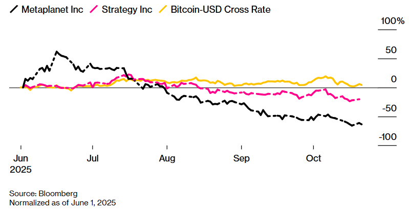 Bitcoin hit a record of $126,251 on October 6 and is up 18% year-to-date, a surge fueled in large part by an explosion of companies dedicated to stockpiling the token. The model pioneered by Michael Saylor’s $70 billion Bitcoin giant Strategy Inc. has given rise to hundreds of imitators globally. They have mostly boasted valuations greater than that of their crypto holdings, underscoring strong investor demand.