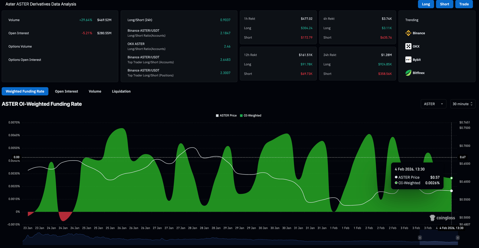 On the derivatives side, CoinGlass data show that ASTER futures Open Interest (OI) is down 5.21% over the last 24 hours to $280.55 million, indicating a lower outstanding contracts value. At the same time, the OI-weighted funding rate stands at 0.0026%, down from 0.0046% at its peak the previous day, suggesting that bullish interest has declined significantly.