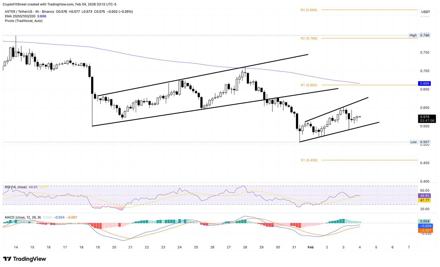 Aster trades below the 50-period Exponential Moving Average (EMA) at $0.66 on the 4-hour price chart, suggesting a broader bearish bias. In the short term, ASTER forms an ascending expanding channel after the bearish breakout of a similar but larger pattern on the same chart.