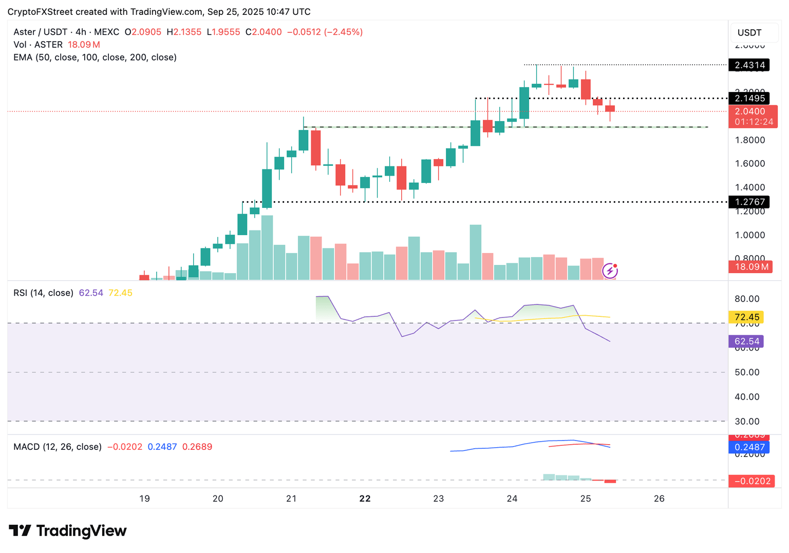 - Aster extends decline from new all-time highs of $2.43 as bulls struggle to hold around $2.00.