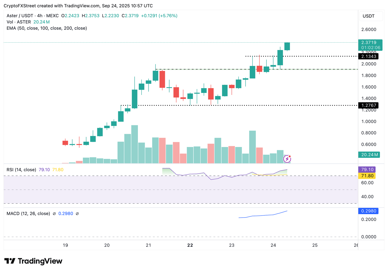 Aster (ASTER) extends its rally trading above $2.34 at the time of writing on Wednesday. The newly launched native perpetual Decentralized Exchange (DEX) token is up 18% on the day, reflecting growing demand, especially from whales.