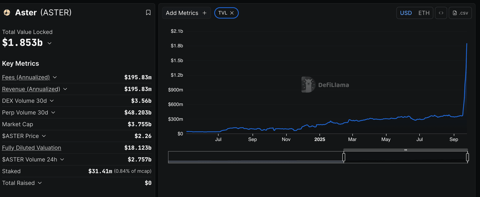 - Aster’s DeFi TVL hits $1.85 billion, the highest level on record as interest in the perpetual DEX token surges.