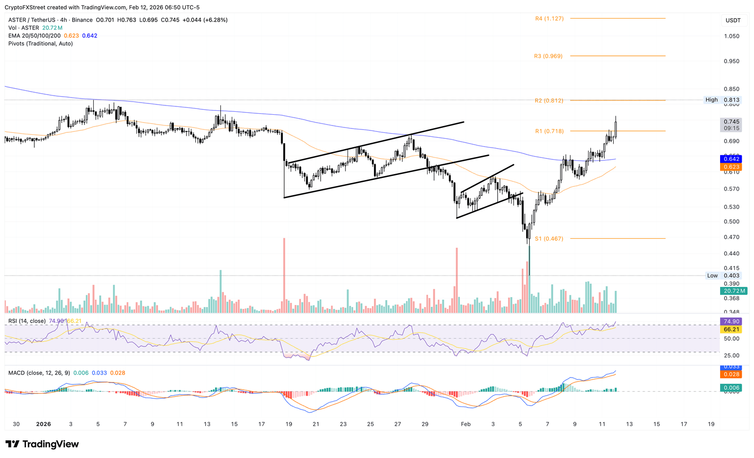 ASTER is holding steady above $0.740 at the time of writing on Thursday, with roughly 9% gains in the day. The perp-DEX token has surpassed the R1 pivot point at $0.718 on the 4-hour chart but requires a decisive candle close to confirm the breakout. If ASTER closes above this level, the rally could extend to the R2 pivot point at $0.812, followed by resistance at the R3 pivot point at $0.969.