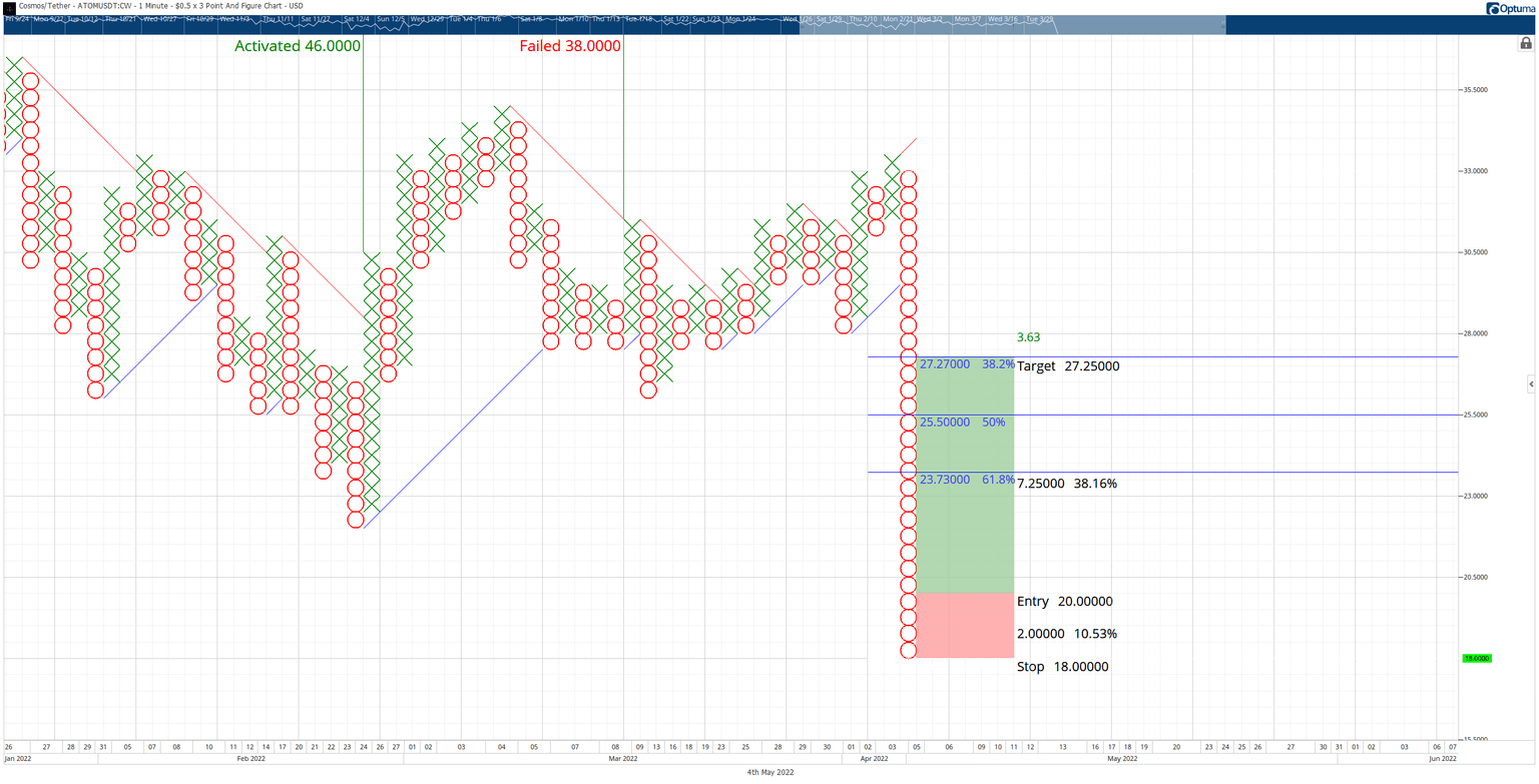 From a bullish perspective, there is a theoretical long opportunity for ATOM price on the $0.50/3-box Reversal Point and Figure chart. The long idea is a buy stop order at $20, a stop loss at $18, and a profit target at $27.25.