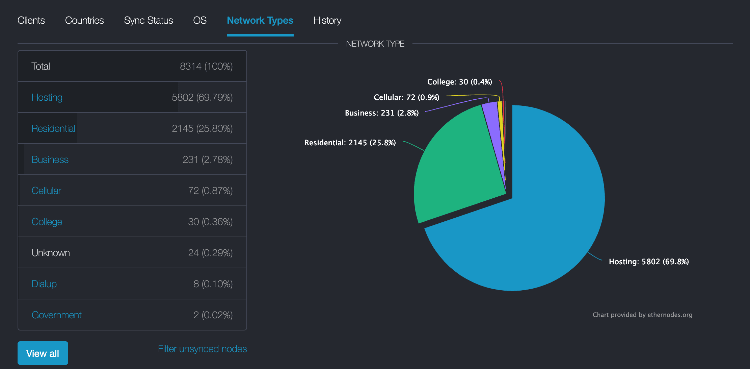 According to the Ethereum mainnet statistics, nearly 70% of ETH nodes are hosted.