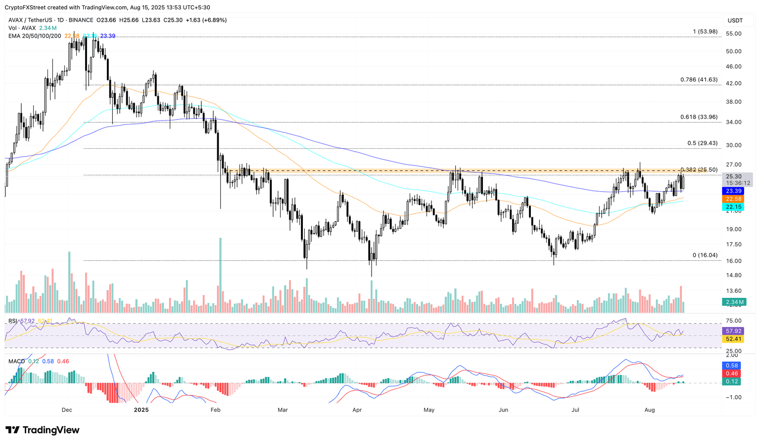 Avalanche (AVAX) edges higher by nearly 7% at press time on Friday, nearly overcoming the loss from the previous day. The quick reversal is underpinned by the announcement of Dinari Financial Network launching US tokenized stocks on Avalanche, alongside improving network metrics such as TVL and Decentralized Exchange (DEX) volumes.