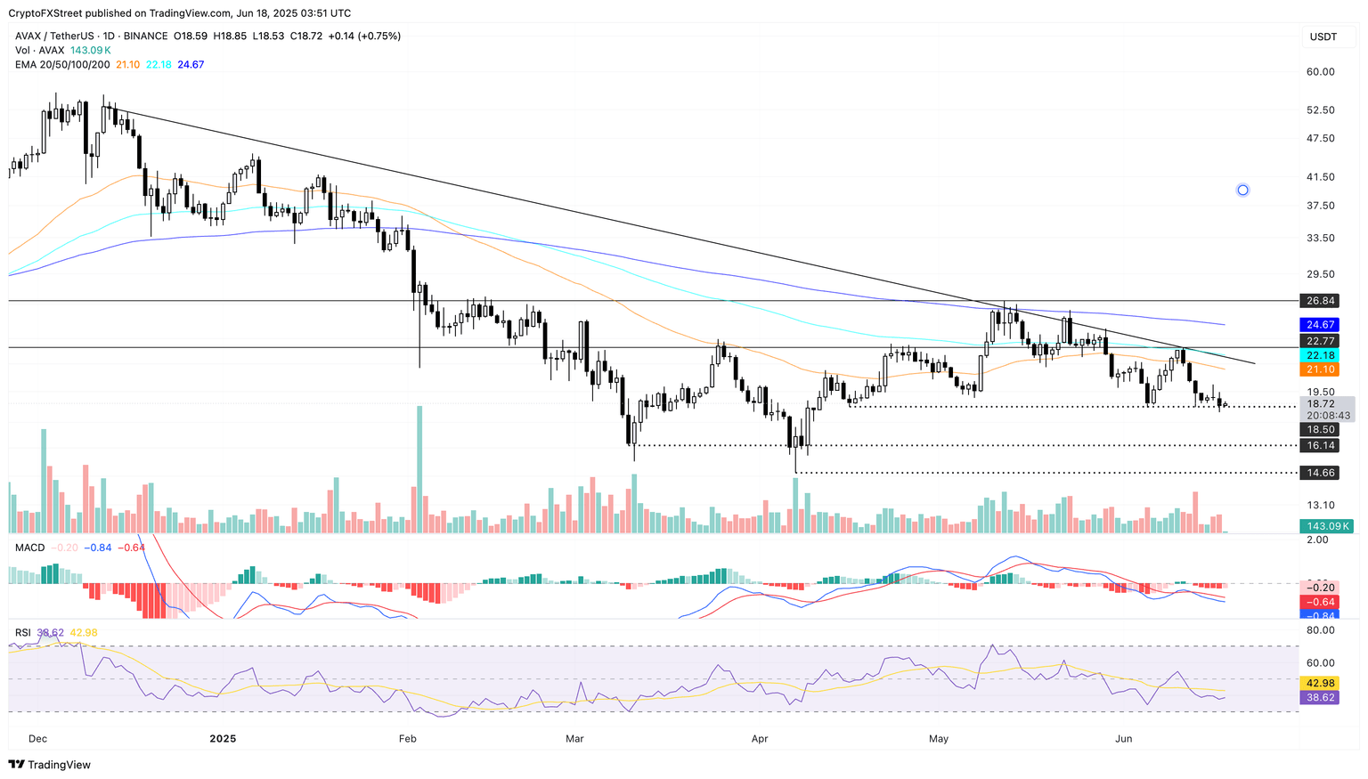 Avalanche could extend its losses towards $16.14 support if it closes below the $18.50 floor, followed by the year-to-date low of $14.66.