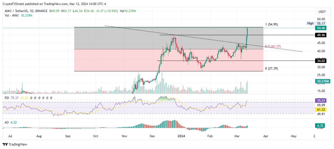 - AVAX could extend the gains 10% to the $60 milestone as bulls show no signs of stopping.