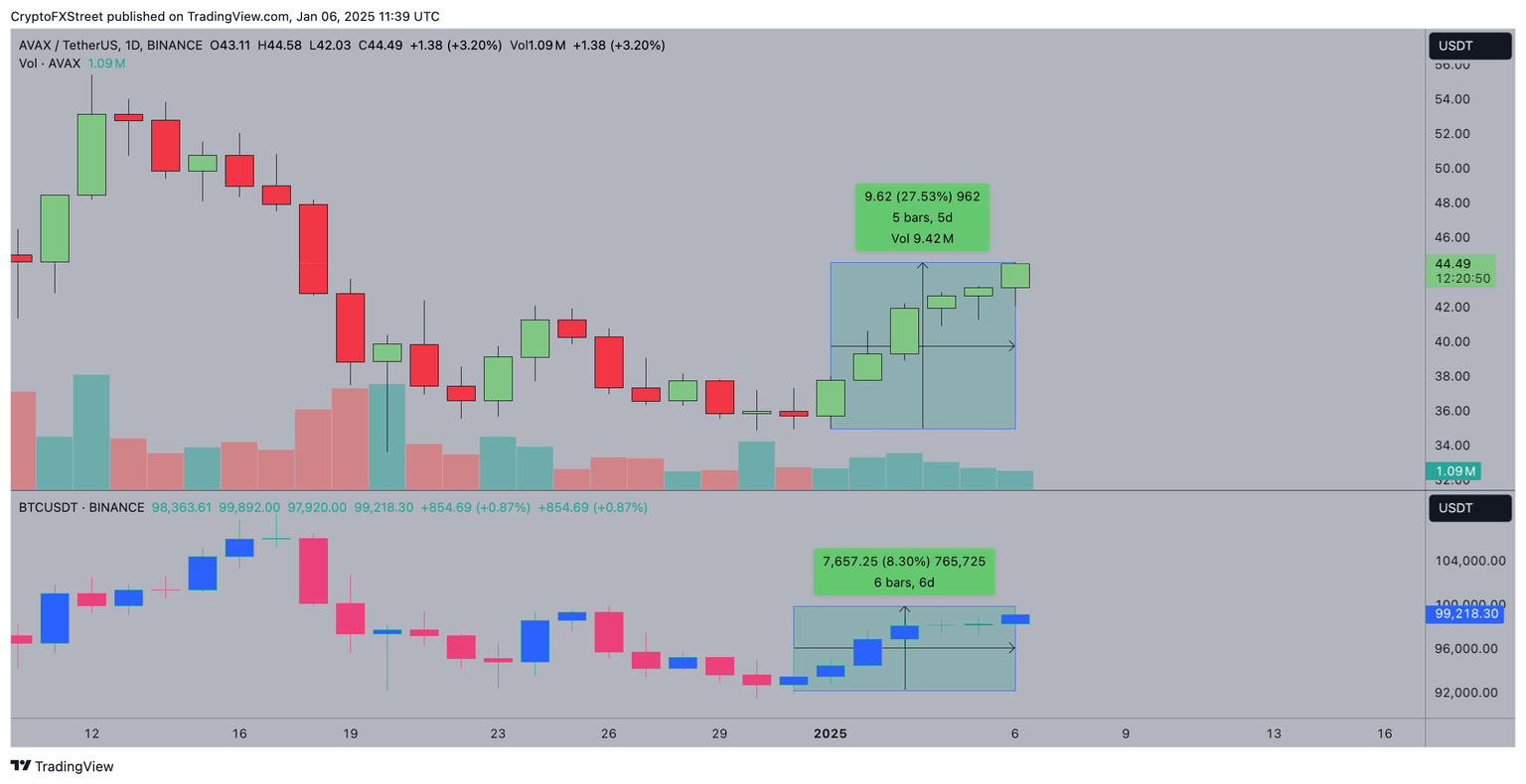 The chart above shows the AVAX price climbed 27.8% since the start of 2025, tracking Bitcoin’s 8% gains between December 31 and January 6.