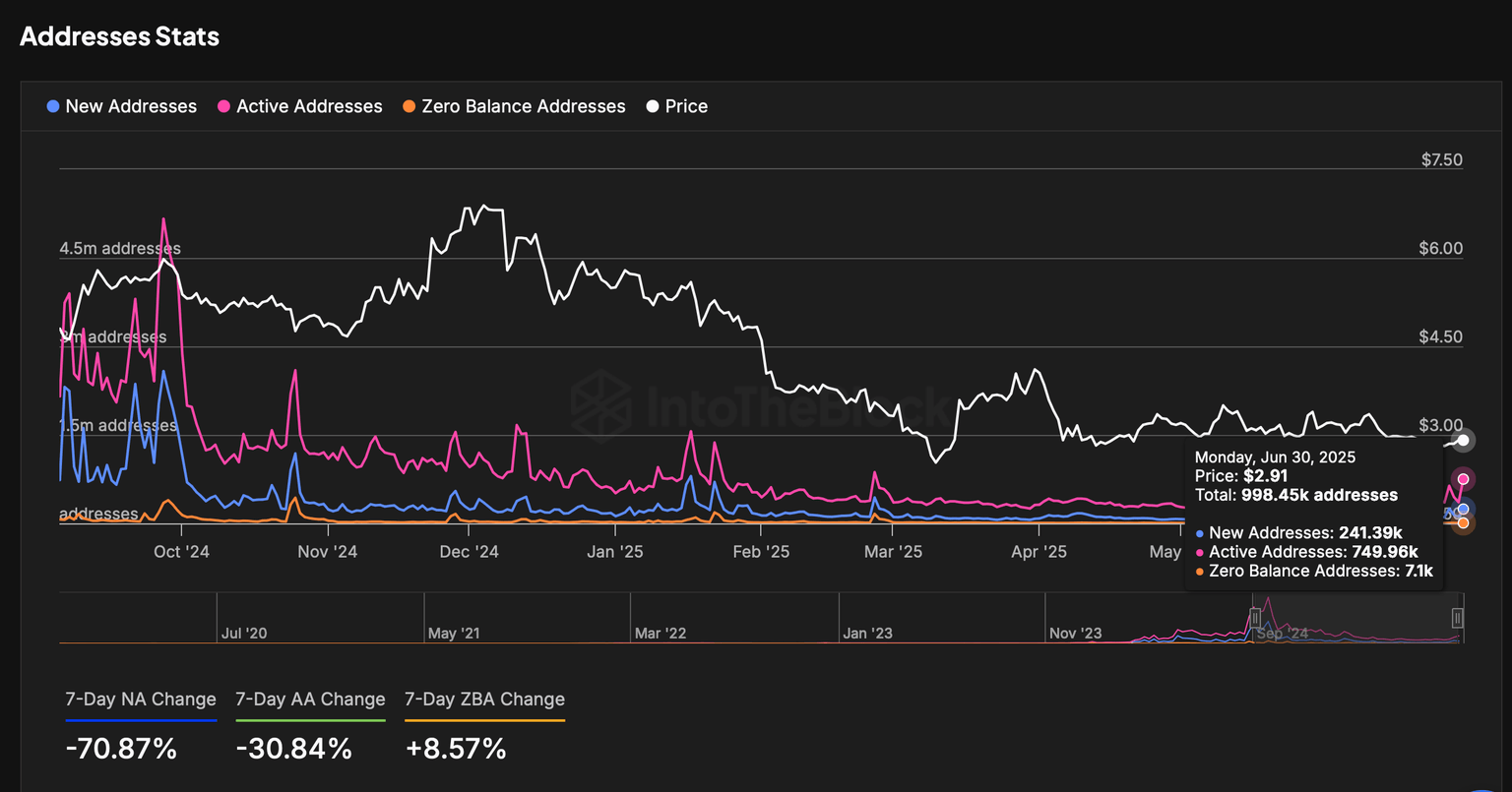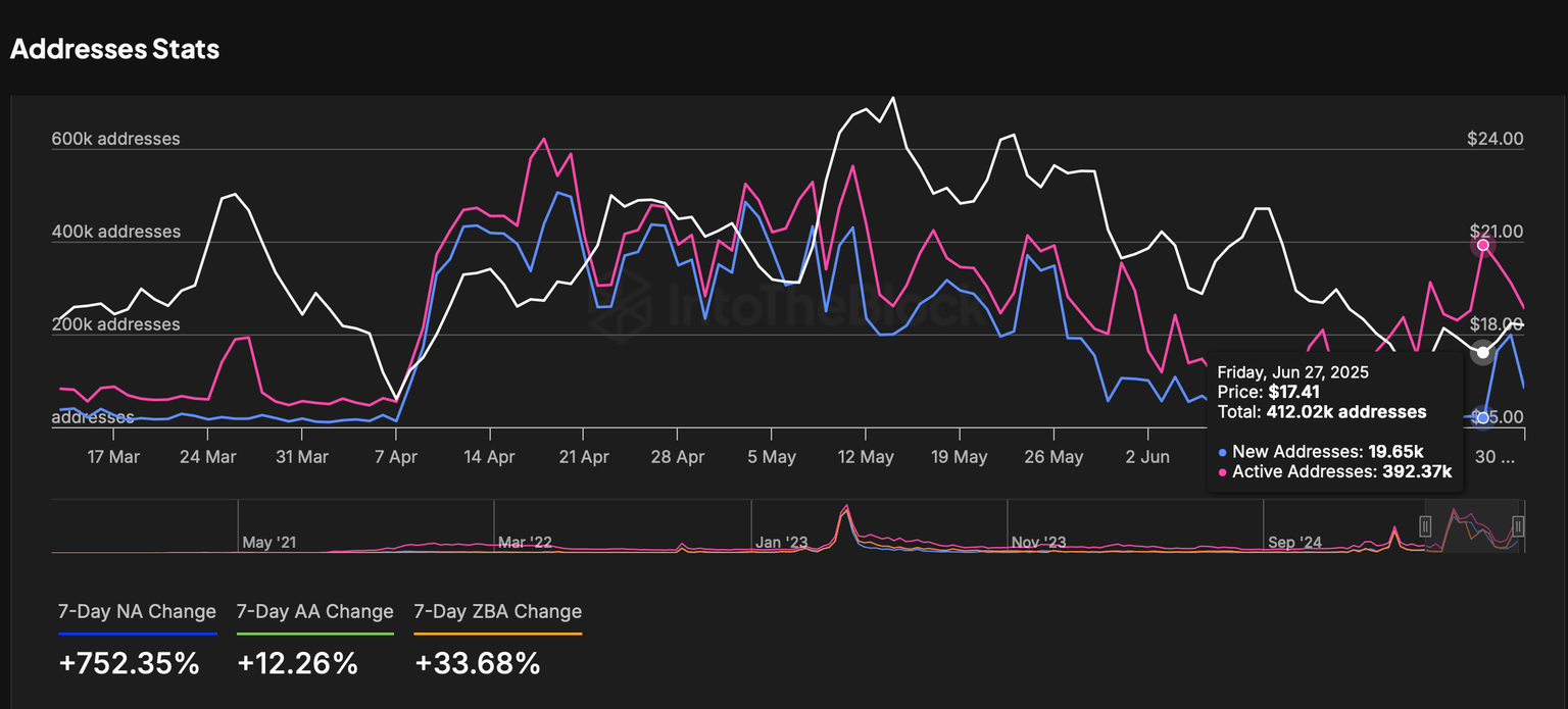 Active addresses on TON currently stand at approximately 750,000, up from 365,000 on June 2. The number of newly created addresses on the protocol surged to about 241,000, up from roughly 133,000.