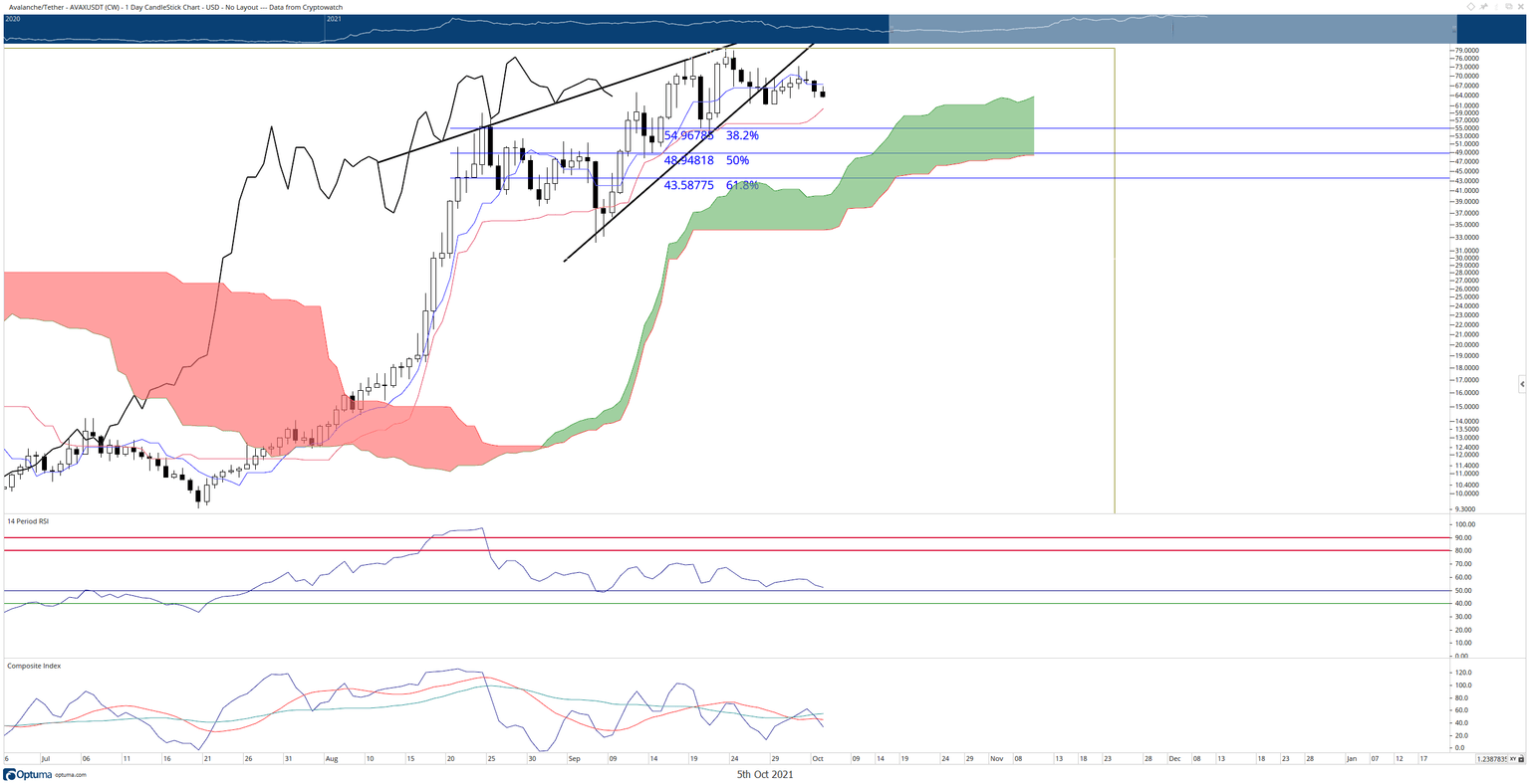 While the current AVAX price action remains bullish, one look at the weekly Ichimoku chart shows a glaring issue within the Ichimoku Kinko Hyo system. There is a substantial and persistent gap between the current close and the weekly Tenkan-Sen, which is at $47. Significant gaps between the close and the Tenkan-Sen do not last long within the Ichimoku system and often correct very swiftly. Therefore, it is only a matter of time before a strong mean reversion correction will push AVAX lower to test the Tenkan-Sen as support.
