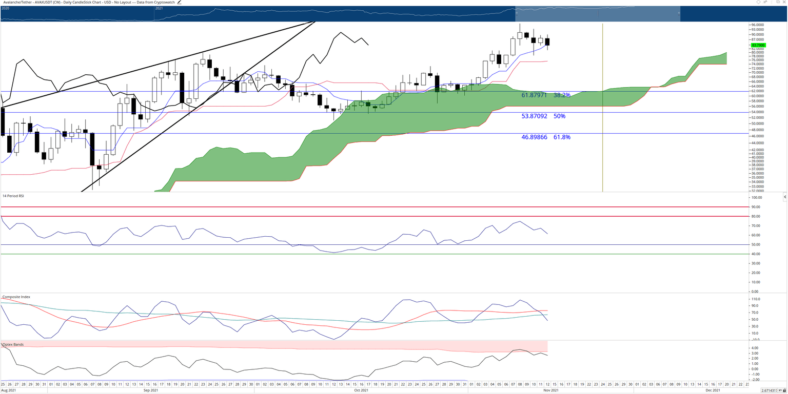 AVAX price has been on a steady uptrend since the most recent significant swing low of $51 on October 12th. Since October 12th, AVAX has gained a staggering 90% without a meaningful retest or pullback. The rejection near $100 was the first sign that a pullback may occur – but it has yet to happen.