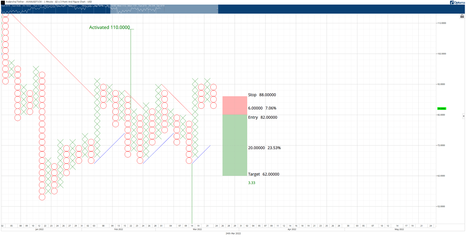 AVAX price has two very strong trade opportunities on its $2.00/3-box reversal Point and Figure chart, one long and one short.