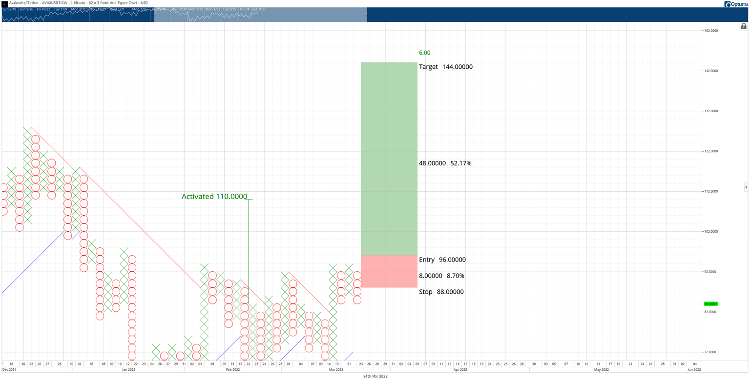 The hypothetical long setup for AVAX price is a buy stop order at $96, a stop loss at $88, and a profit target at $144. The trade represents a 6:1 reward for the risk with an implied profit target of 52% from the entry. A trailing stop of two to three boxes would help protect any profit made post entry because it is highly unlikely that AVAX will move $144 in a single X column.