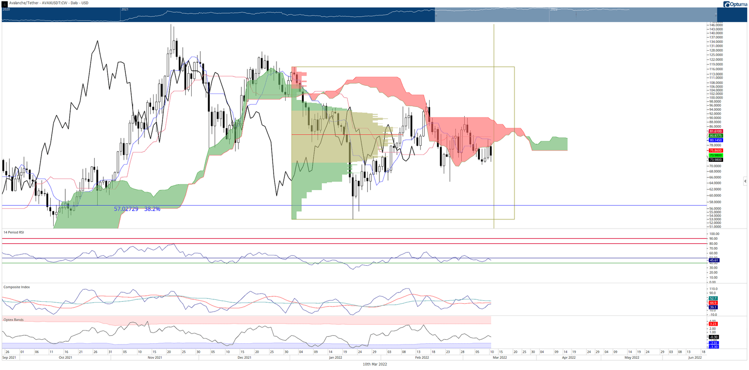 AVAX price confirmed an Ideal Bearish Ichimoku Breakout entry this past Sunday (March 6, 2022), but without any follow-through selling. Instead, buyers spent Monday – Wednesday attempting to push AVAX back inside the Ichimoku Cloud but have been handily rejected from doing so.