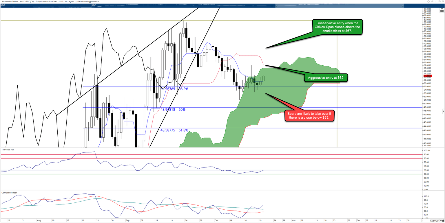 AVAX price looked as if its downtrend from the rising wedge would continue, but it found some support instead. The Tenkan-Sen and 38.2% Fibonacci retracement at $55 found buyers to hold AVAX from any further downside movement. Buyers now look like they could return to support AVAX even further by moving higher and towards new highs.