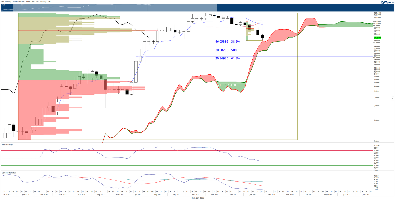 Axie Infinity price has found some support against the top of the weekly Cloud (Senkou Span B) at $44.25 and the 38.2% Fibonacci retracement at $46. A bounce from these lows should be expected, especially given the extreme oversold conditions on the weekly chart.