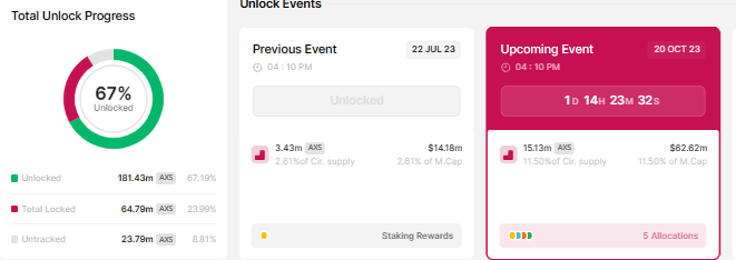 As part of the bearish catalysts, the Axie Infinity ecosystem has a cliff token unlock event barely a day out. The event, slated for October 20, will see up to 15.13 million AXS token flood the market, adding to its circulating supply. Based on current rates, these tokens are worth approximately $62.62 million.