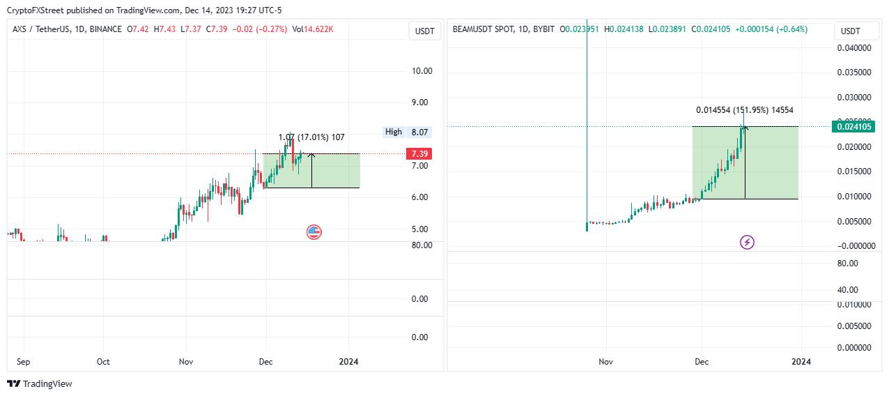Axie Infinity (AXS) price is up 17% since the onset of December 15 in a rather dry or gentle slope. Over the same duration, Beam (BEAM) coin price has soared 151% with a steep climb. Despite being a late entrant, BEAM market capitalization is $1.103 billion against AXS’s $975 million, with the former being a clear usurper.