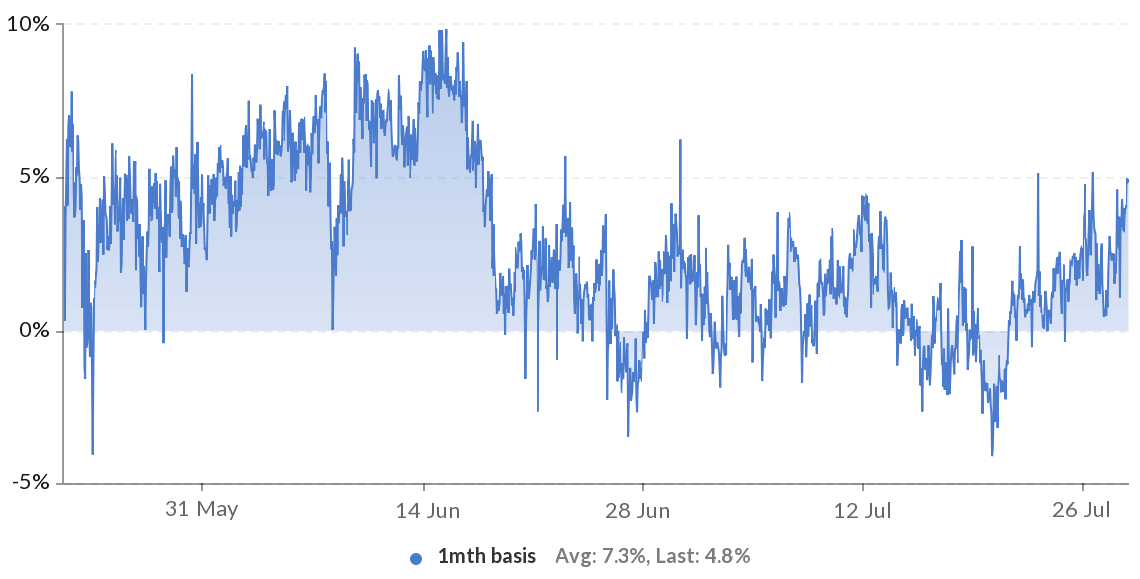 According to the chart above, the one-month futures contract has been unable to recover an annualized premium above 5%. Some periods of backwardation happened over the last month, although the current level is deemed neutral.