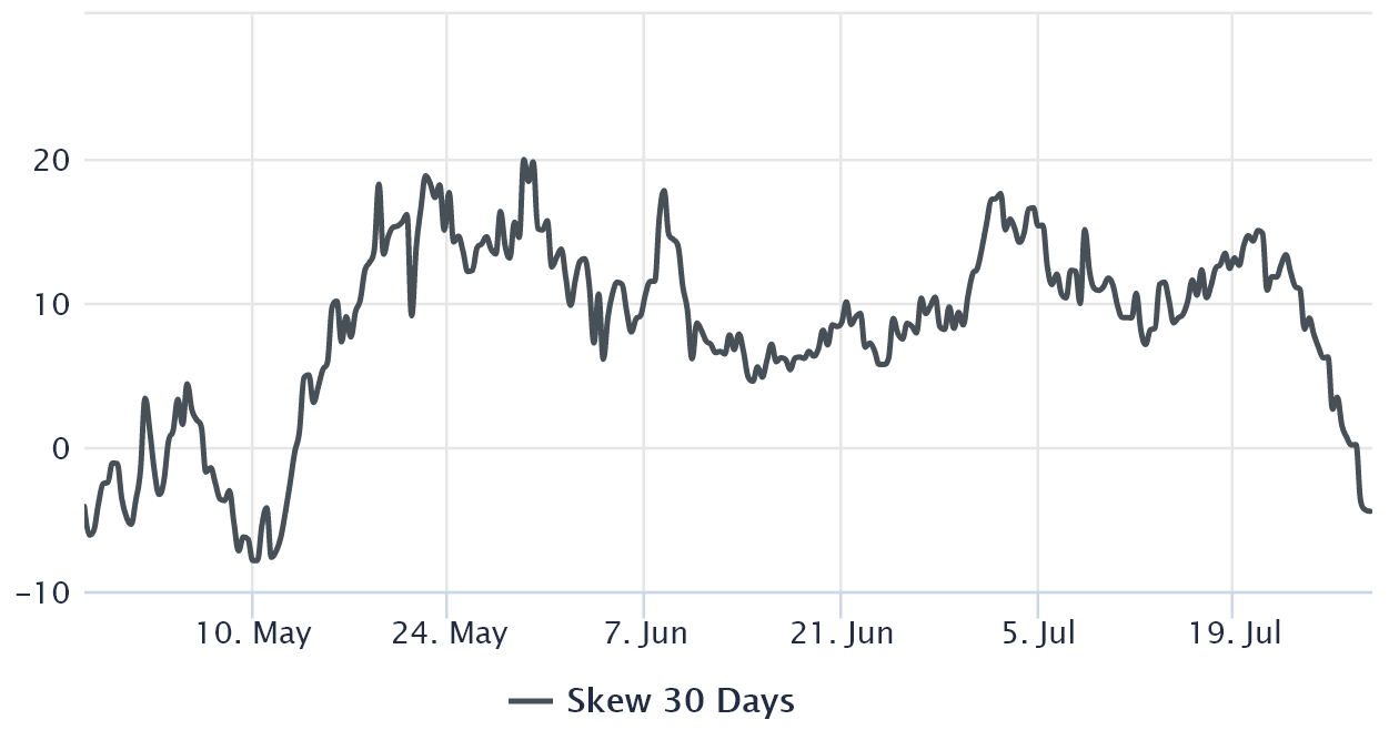 When the figure oscillates between negative 10% and positive 10%, the indicator is deemed neutral. The 25% delta skew indicator had been signaling 'fear' between May 14 and July 24.