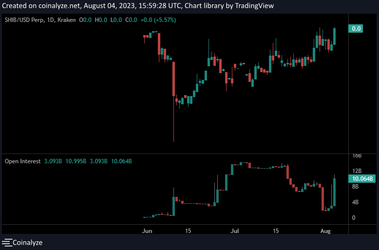 Shiba Inu price is already up 5% on the day, as of press time, with a 24-hour trading volume surge of 70%, the SHIB market has turned active with prospects for more gains. Historically, an increase in open interest coupled with a sustained price surge confirms an uptrend.