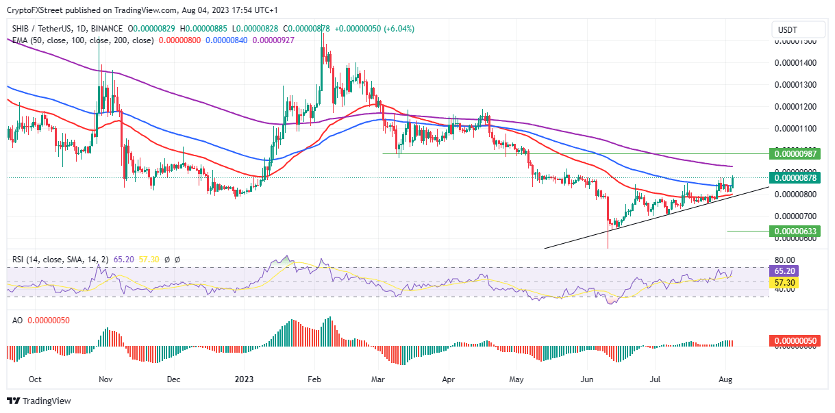 Shiba Inu (SHIB) is auctioning at $0.00000877 at the time of writing, flaunting a long green bar as bulls lead the market. Increased buyer momentum above current levels could see SHIB tag the 200-day Exponential Moving Average (EMA) at $0.00000927 after a substantial breach of the 100-day EMA hurdle at $0.00000840.