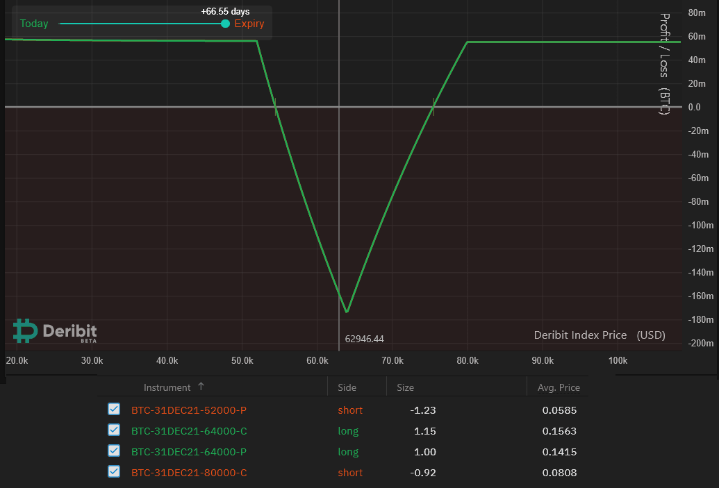 For this investor to profit, one needs Bitcoin price to be below $54,400 on Dec. 31, 2021 (down 14%) or above $75,500 (up 19%). The theoretical risk-reward is not good because the maximum payout is 0.056 BTC and the potential loss is over 3 times that amount.