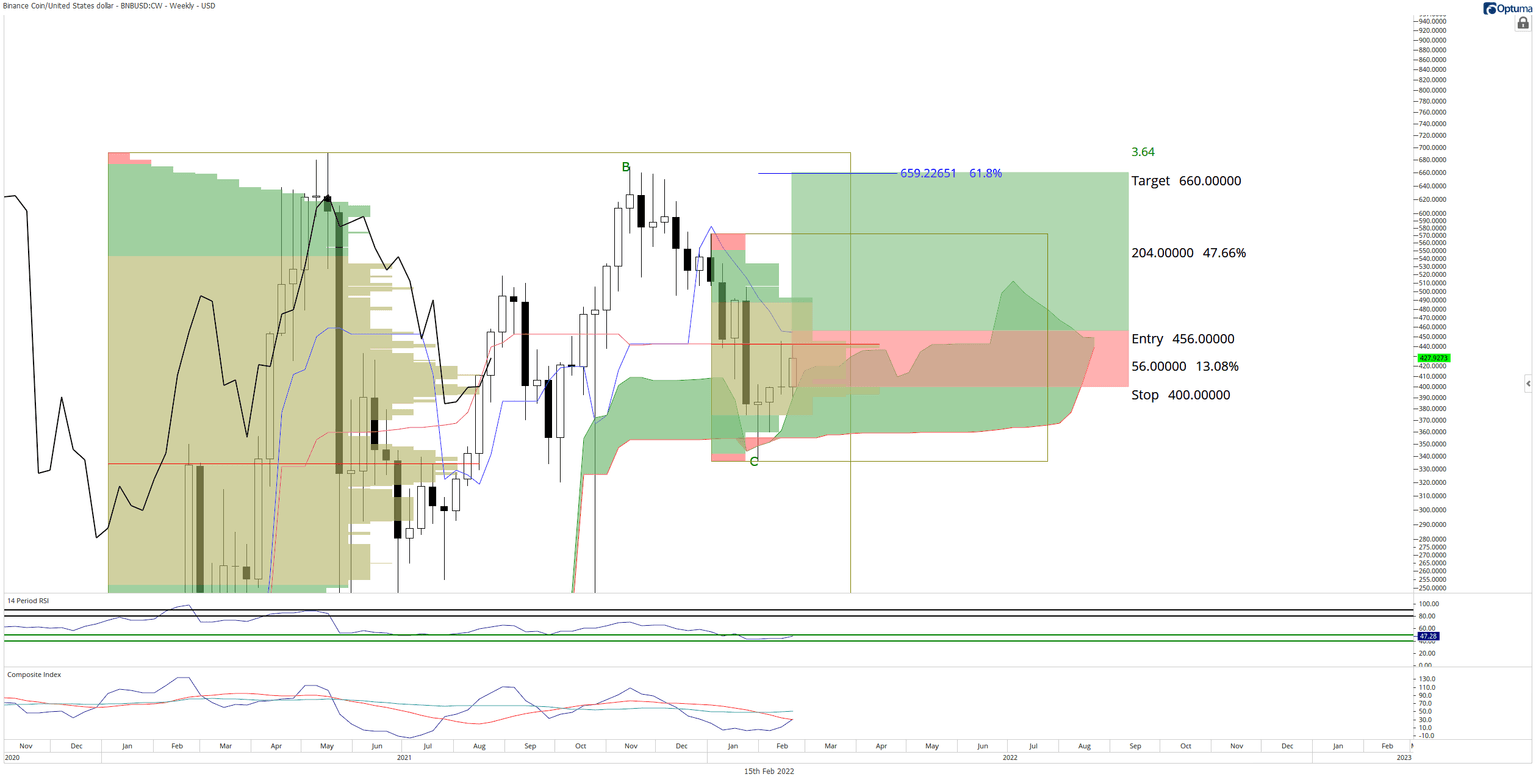 The hypothetical long entry for Binance Coin price and bullish outlook will be invalidated if there is a weekly close inside the Ichimoku Cloud at or below the $380 value area.