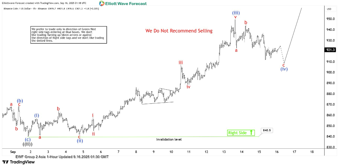 The short-term Elliott Wave outlook for Binance Coin (BNB/USD) shows a rally from the August 26, 2025 low. This move is unfolding as a five-wave impulse. Wave ((i)) peaked at 881.2. Wave ((ii)) dipped to 839.5. The internal structure of wave ((ii)) formed a zigzag pattern. Wave (a) fell to 850.8. Wave (b) climbed to 868.5. The last leg wave (c) dropped to 840.5, completing wave ((ii)).