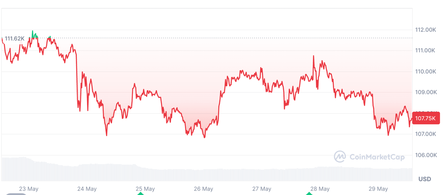 Bitcoin’s (BTC $107,814) current all-time high of $111,970 was reached on May 22, but it has since fallen to trade around $107,750, according to CoinMarketCap data.