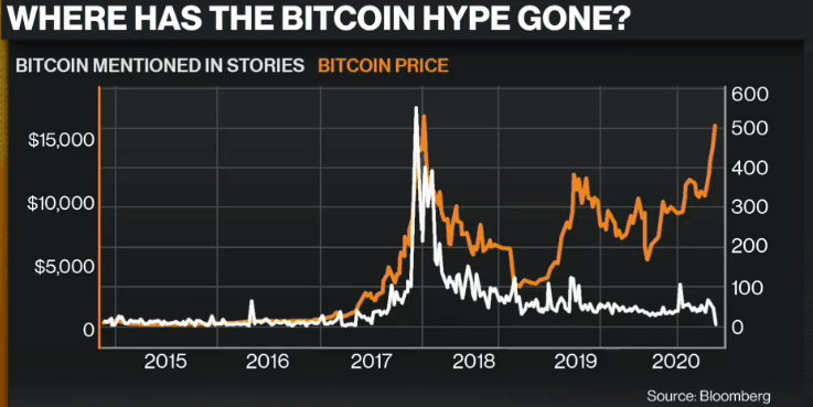 …but public interest, as measured by mentions of bitcoin in media articles, is at a low ebb: