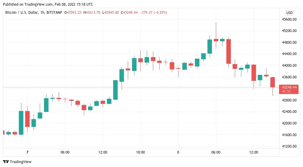 Data from Cointelegraph Markets Pro and TradingView followed BTC/USD as it neared $43,000 after previously hitting new multi-week highs of $45,500.