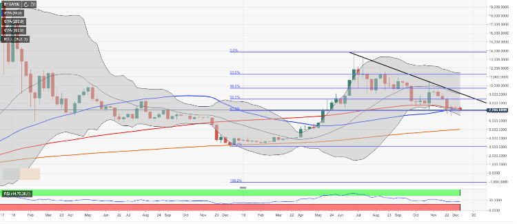 If we zoom out to the weekly chart, we can clearly see that BTC/USD is moving within a downside channel. In October, the similar consolidation pattern of three doji candles ended in a strong recovery, though the trend remained unbroken. This time we may see similar momentum with the price recovering towards $9,000-$9,100 during the pre-Christmas week. This movement will qualify for Santa's rally. However, we will need to see a sustainable move above $9,150 (the sloping trendline) for the recovery to gain traction in the long run and put the current bearish trend at risk.