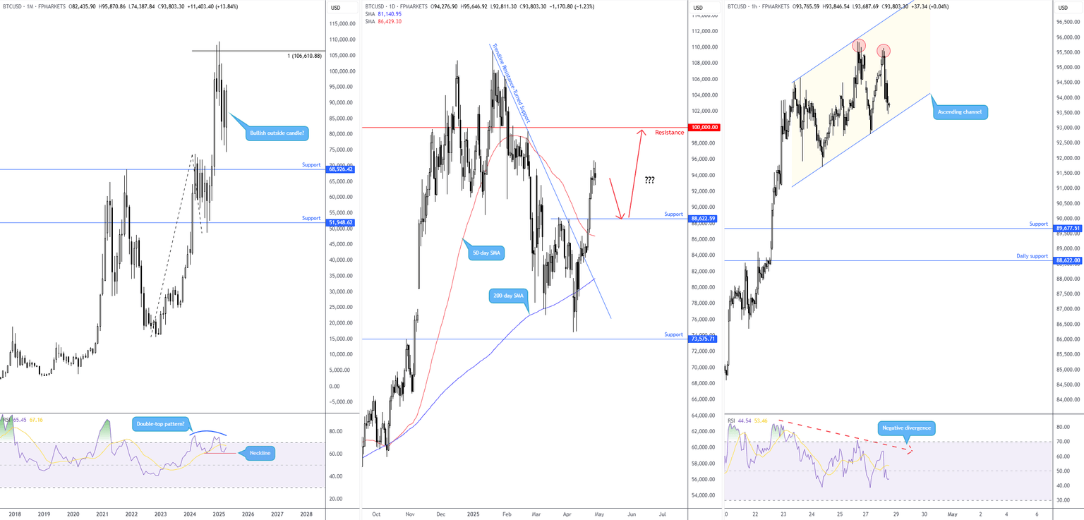 With monthly flow on the verge of establishing a bullish outside candle, and scope for additional outperformance evident on the daily chart to at least US$100,000, a retest of US$88,622 as support could prompt a bullish scenario. Consequently, a possible downside move in the short term might be on the table before targeting US$100,000 as per the red arrows.