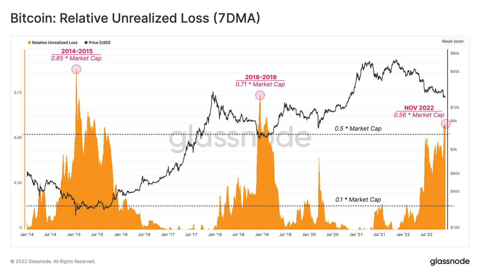 A popular crypto investing saying is “you cannot lose if you do not sell.” Unrealized losses track the entire Bitcoin market versus total market capitalization. The November 2022 56% unrealized loss is the largest in the current bear market. In 2014-2015, unrealized losses hit an all-time high for Bitcoin holders at 86%. The current unrealized losses are the fourth largest in Bitcoin’s history.