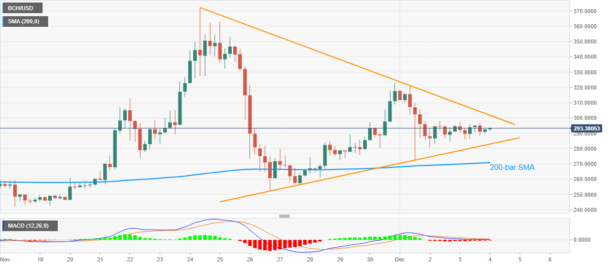BCH/USD rises to 293.83, up 0.50% intraday, during early Friday. Even so, the crypto pair keeps the two-day-old trading range below 298.00 while also respecting a short-term symmetrical triangle formation established from November 24.