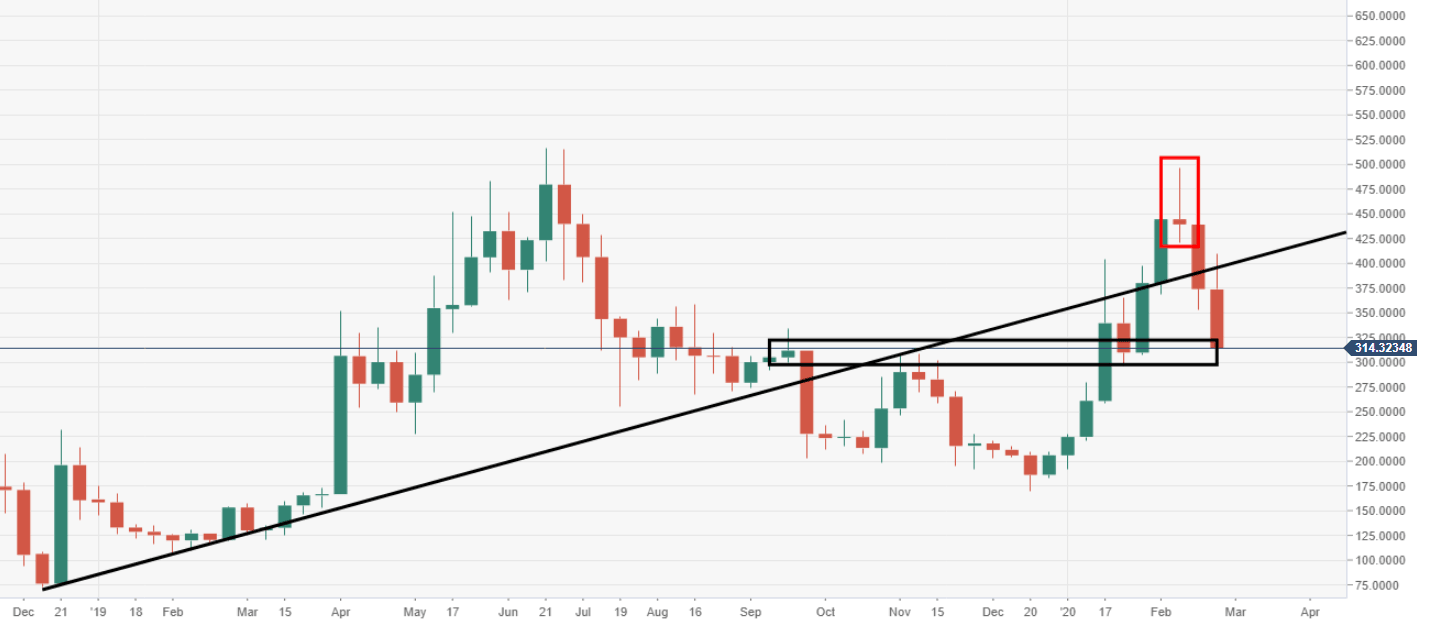 Critical daily support should be noted at the $300 price mark, failure to hold could see a drop-down to $180, pre-2020 bull run levels.