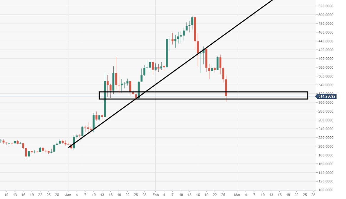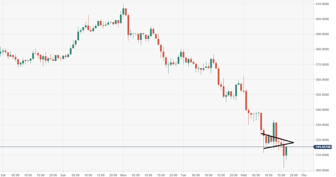 - The psychological $300 mark, also support, is at risk of being tested to the downside by BCH/USD.