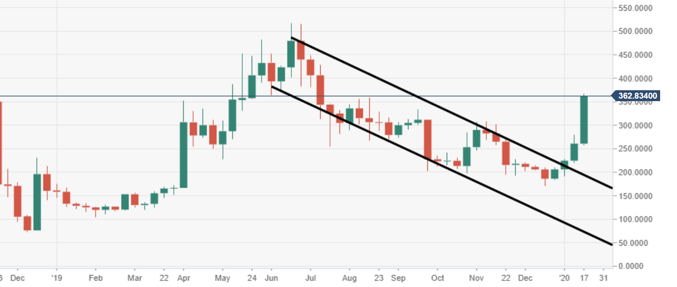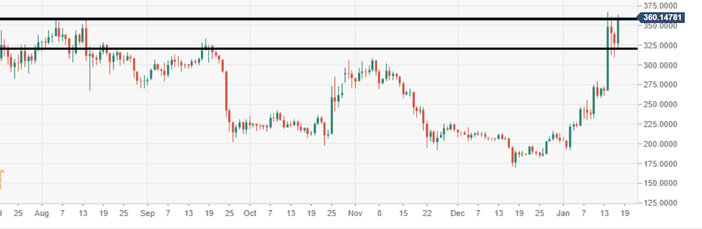 - Should the barrier at $360 be broken down, the next major price mark will be eyed at $500.