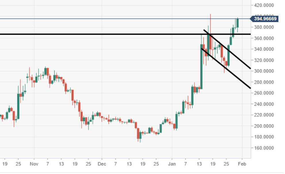 - A break into $400 should provide a decent platform for a fast return into $500.