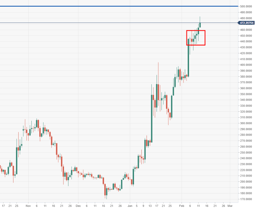 - BCH/USD bulls have been climbing for going on eight sessions now, breaking a barrier at $450.