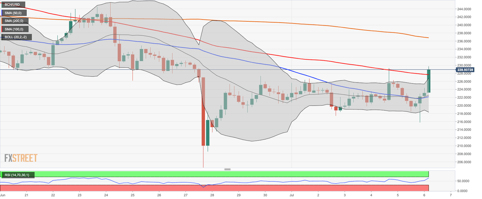 On the intraday chart, BCH/USD broke above a strong local resistance level created by a combination of 1-hour SMAs at $222.00. The move created a strong momentum and pushed the price above the upper line of the 1-hour Bollinger Band (BB) and 4-hour SMA100 at $227.68. If the bullish trend gains traction, the price may retest $230.00 for the first time since June 27.