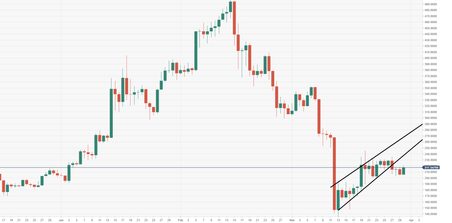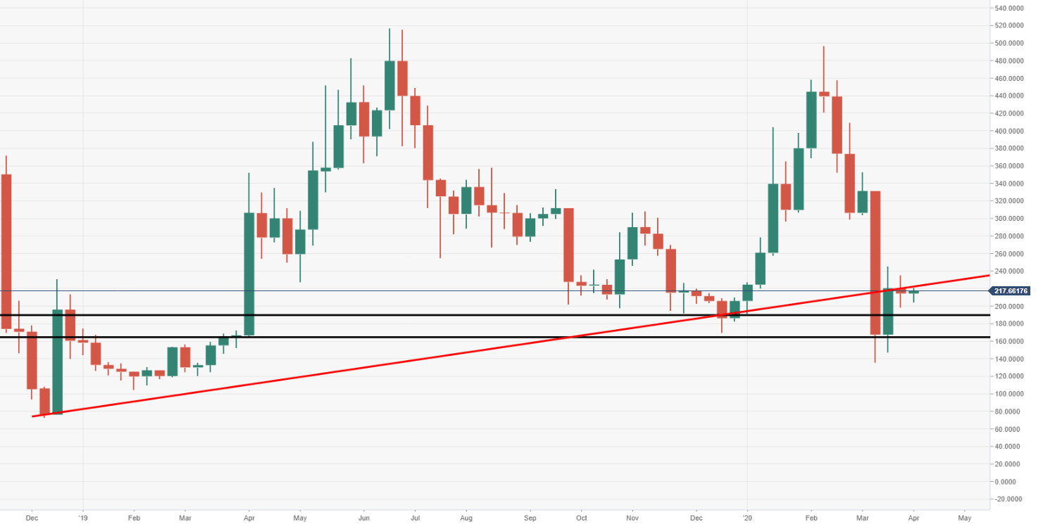 The price closed in the red for the week, as vulnerabilities stack up for another potential drop. Should the bears breakdown the psychological $200 mark, it would likely open the door to another wave of selling.
