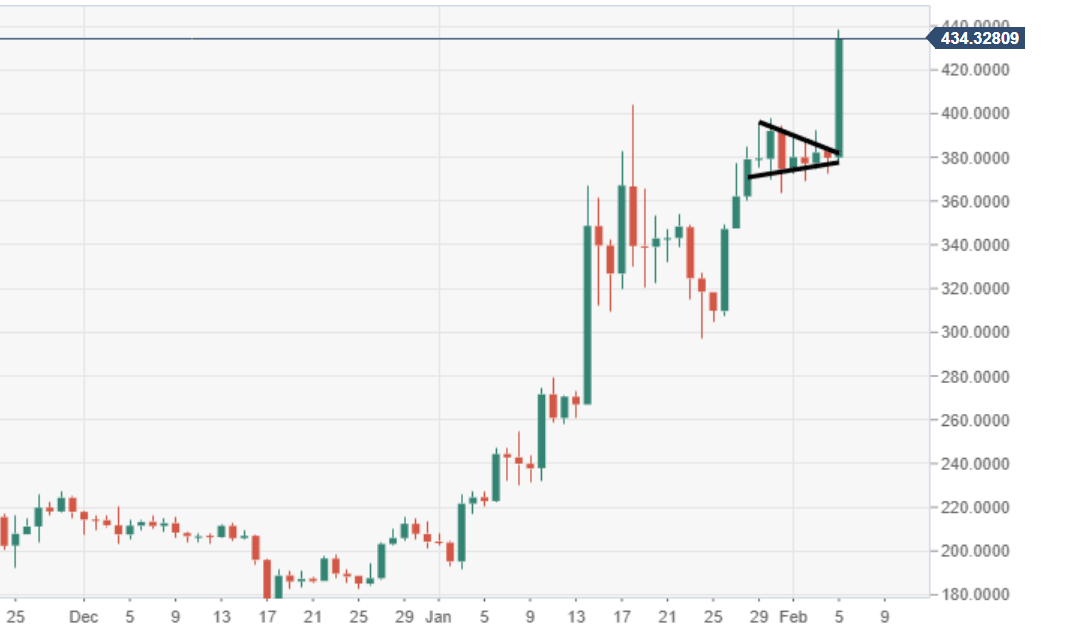 - The bulls escaped a mundane range of $390 to the upside, and then $360 to the downside.
