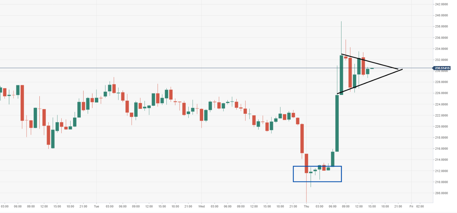 A surge of buying pressure came into play early in the European session, a very much unexpected move, observed across the market. There was no real sign of any significant support area being touched for a technical explanation. Recent price action has formed a narrowing triangular structure, subject to a breakout.