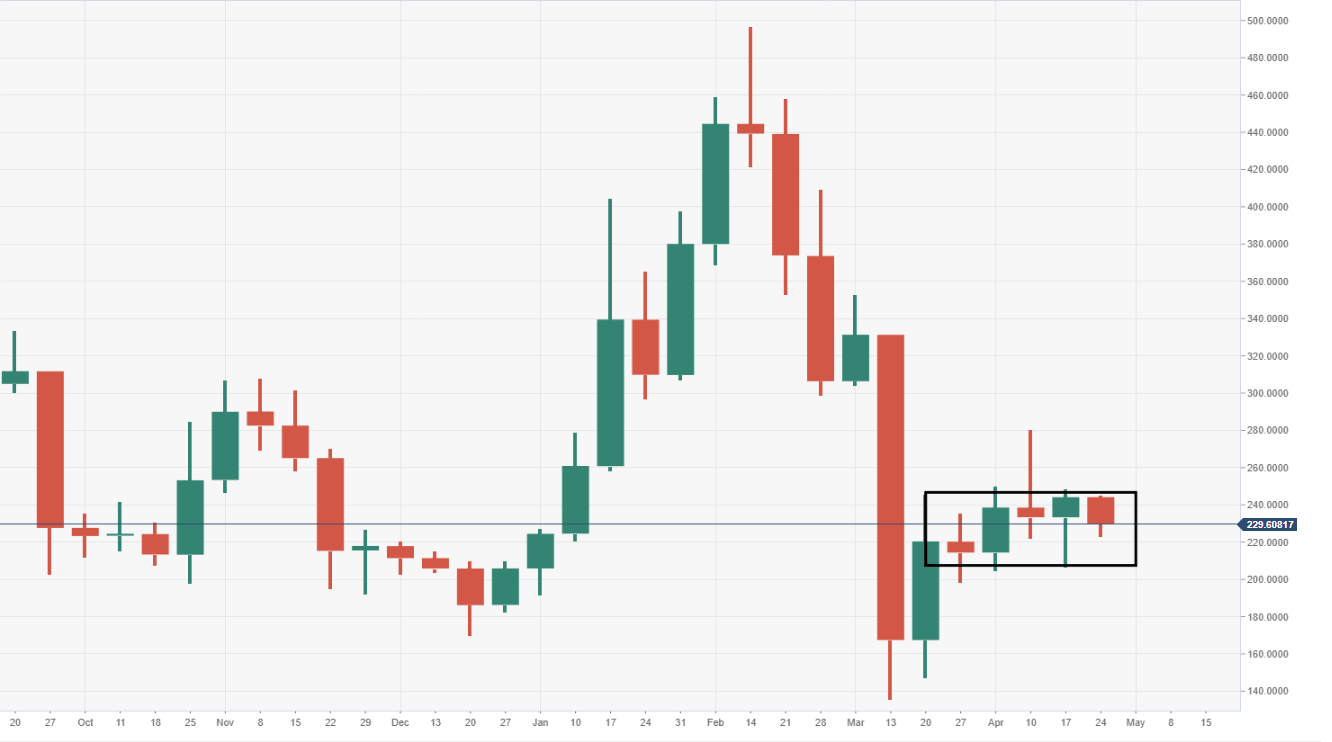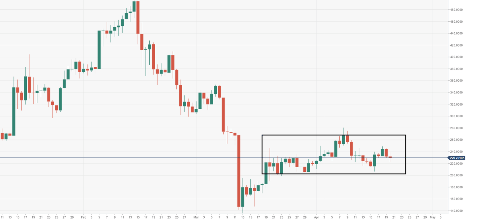 The price is moving within a tight range, the support eyed at $230, resistance up at $250.