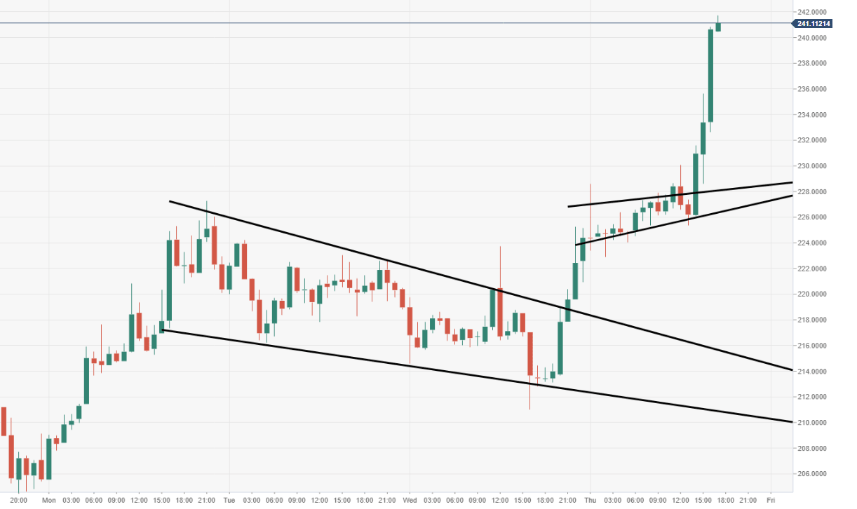 The bulls have smashed out from a pennant structure via the 60-minute chart view, inviting another wave of momentum.